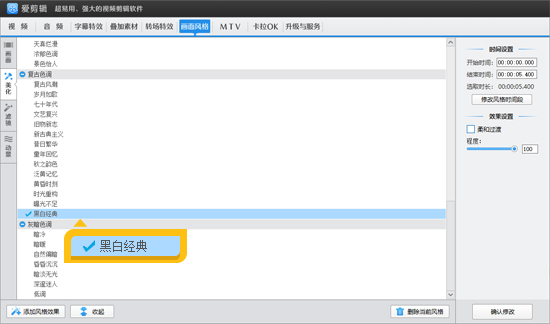 除了通过“AI专业电影调色”功能调出高对比黑白色调,在爱剪辑的“画面风格”栏目中选择“美化”选项,还能找到“黑白经典”效果。点击应用“黑白经典”,同样可以实现高对比黑白色调功能。并且,在应用该效果后,用户还可以根据自己的需求,对相关参数进行进一步微调,如调整对比度、亮度等,以达到最理想的画面效果,让视频的黑白风格更加贴合创作意图。
