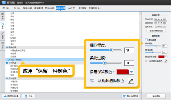 在爱剪辑里面,将视频导入进来。在上面导航条选择“画面风格”,在左边栏目,我们会看到“美化”栏目,找到并应用“保留一种色调”。在中央的参数面板上,使用颜色吸管工具,吸取女子衣服上的红色。我们将“相似程度”设成70,“柔化过渡”设成10,周围的颜色都消失了,只保留了中间那一道显眼的红色。